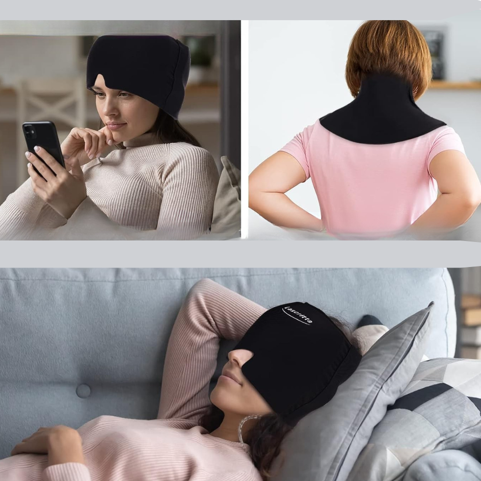 Que incluye Alivio Mind ✅ 1 Gorro terapéutico de gel negro (reutilizable)✅ Gel de enfriamiento de cobertura 180° integrado✅ Bolsa de protección para mantener en el congelador✅ Instrucciones simples de uso